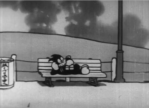 It’s a holiday, and the only dogs left at the barracks are a couple of guards and the newly promoted Norakuro, who as an orphan has no family to visit. He goes out to a yatai, a food cart selling grilled chicken. In a flashback, we see his promotion ceremony. Then he goes to sleep in a dustbin next to a park bench. The poor thing’s still a stray at heart.